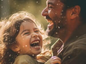 Etwa ab dem vierten Lebensmonat setzt das Lachen ein. Es entsteht zunächst über Körperkontakt z. B. wenn die Mutter das Baby liebevoll an sich drückt und dabei lustige Geräusche macht. Erst mit einem Jahr kommt es zu Lachreaktionen auf komische Ereignisse, z. B. wenn der Vater aus Spaß die Zunge rausstreckt. Wenn Kinder beim Lachen, Kitzeln oder Kichern immer wieder „Noch mal!“ rufen, dann sehnen sie sich nach der wohltuenden Geborgenheit und Zusammengehörigkeit.